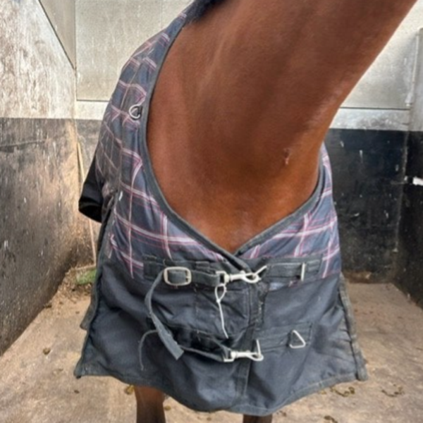 Alle gespen doen het nog goed, geen gaten in de deken. Er zitten bevestigingspunten voor een hals op.